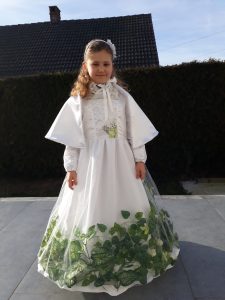 Tel un souffle de printemps tombé sur la neige, cette robe fait germer les feuilles et les fleurs à l’ourlet de sa blancheur immaculée. Son col satiné et son cœur fleuri murmurent le secret d’un jardin rêvé
