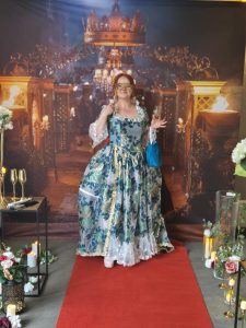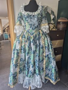Éclatante de brocart et de dentelles, la robe évoque les fastes oubliés d’un bal à Versailles. Ses fleurs nacrées et ses galons dorés scintillent comme des sortilèges d’aristocratie, tandis que ses volants de dentelle murmurent des souvenirs de minuit enchanté.