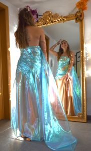 Tulle irisé, satin pêche et perles cousues main comme des bulles d’air…