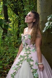 Robe de mariée des royaumes invisibles, tissée de brume, de pétales et de lumière douce.