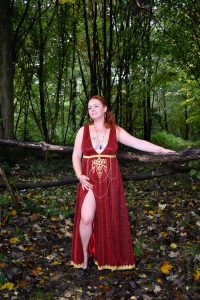 Velours rouge feu, or brodé et chaînes mystiques… chaque pas murmure un sortilège. 🔥🖤