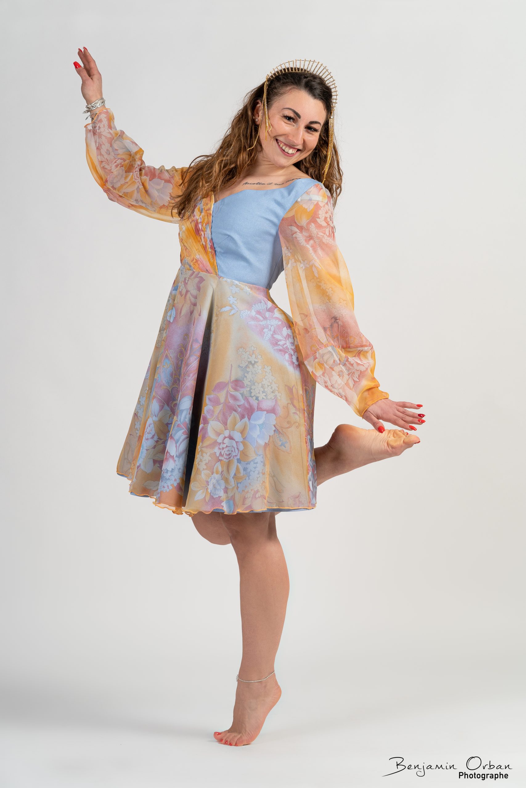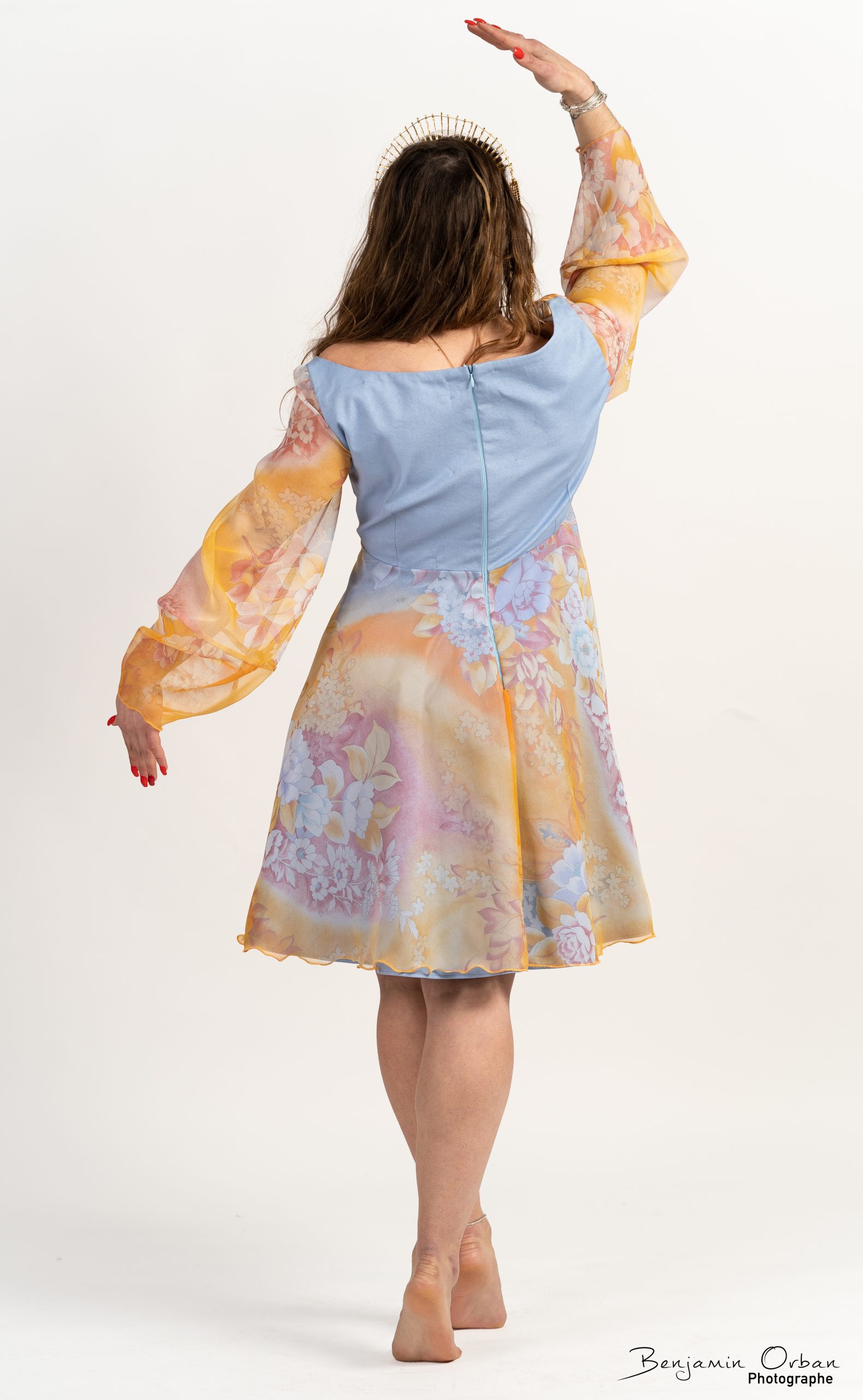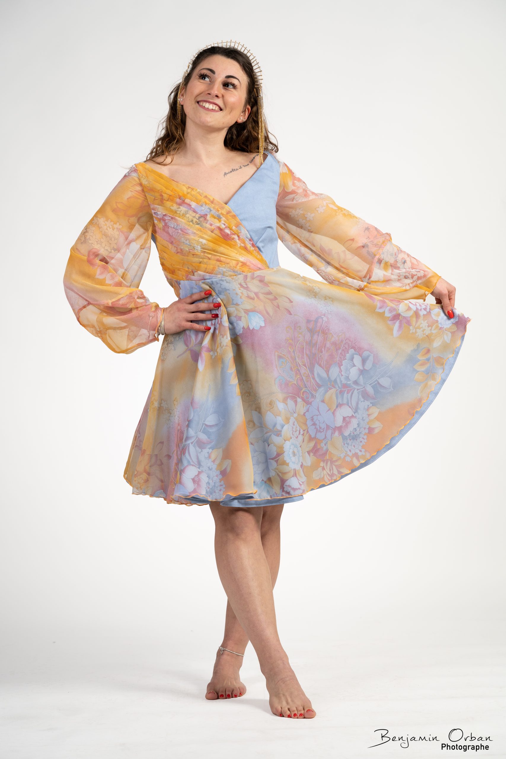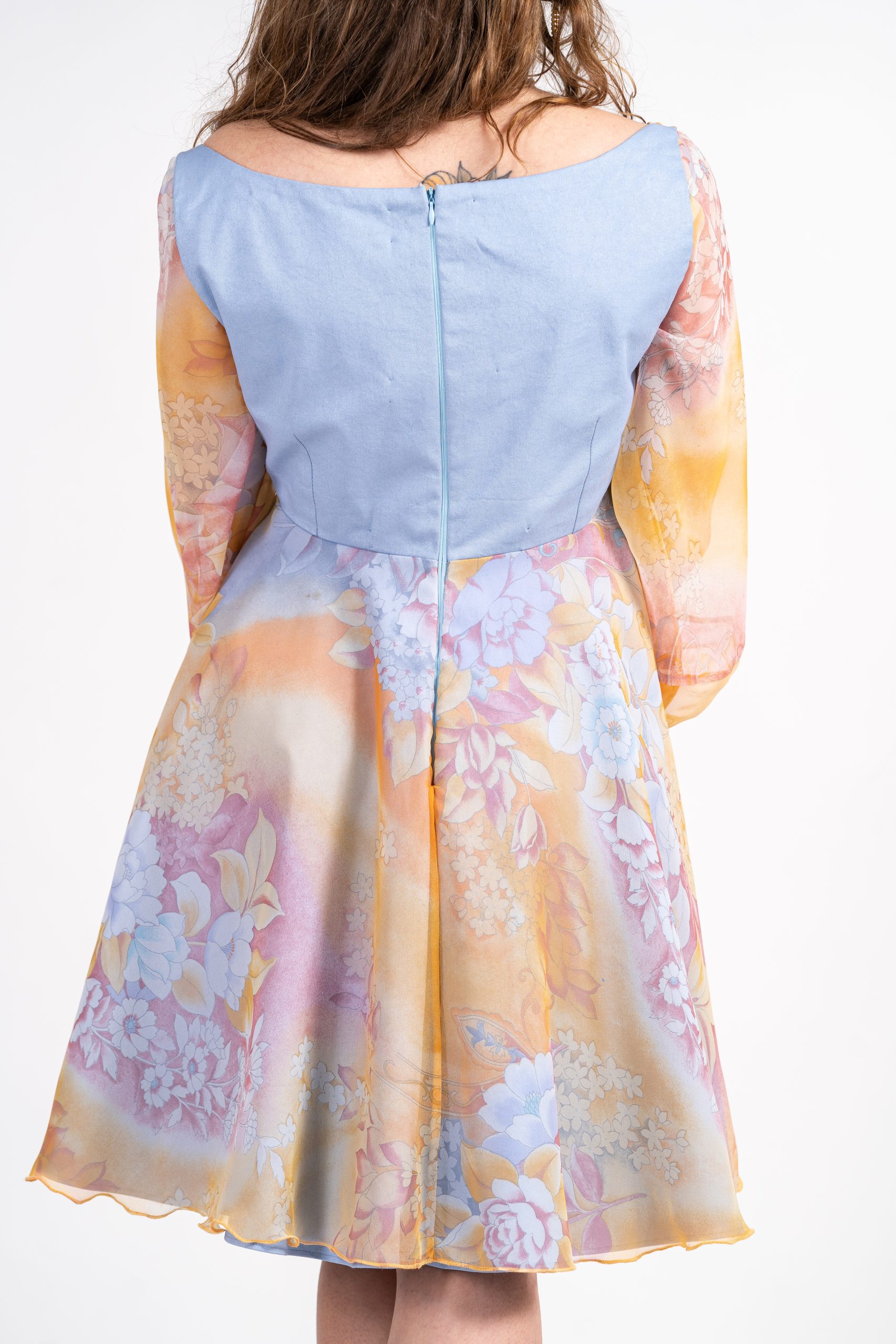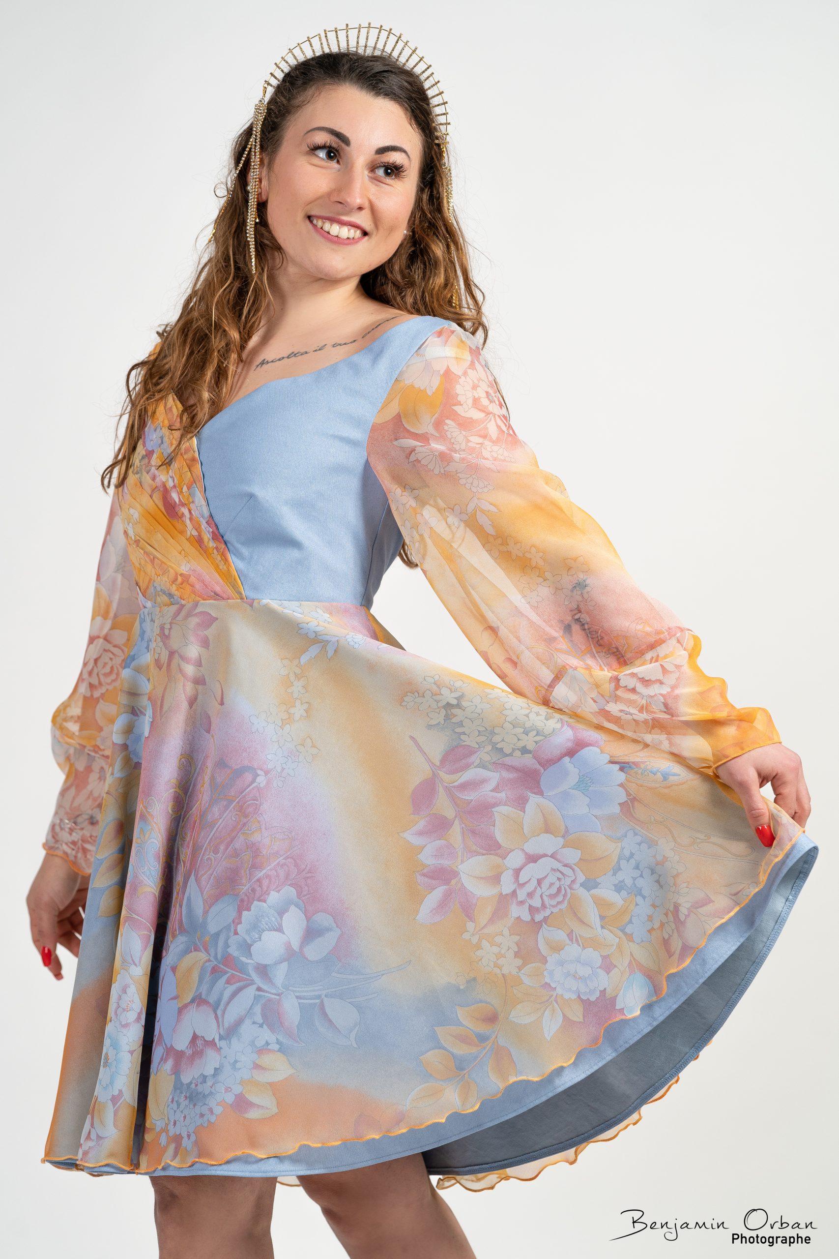 Une robe aérienne en jean bleu clair, brillant et mousseline fleurie, drapée sur le corsage.