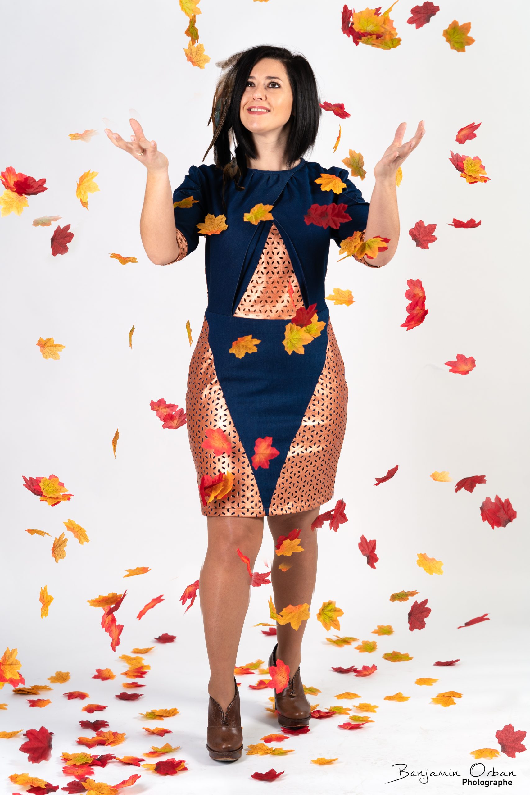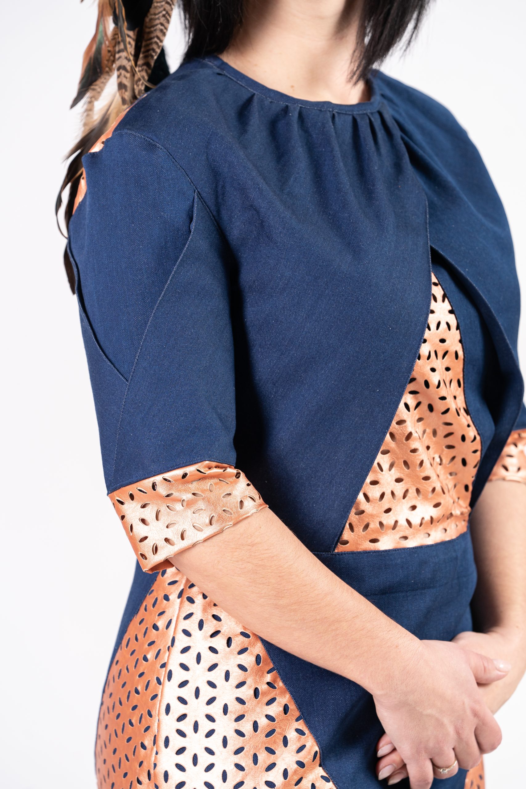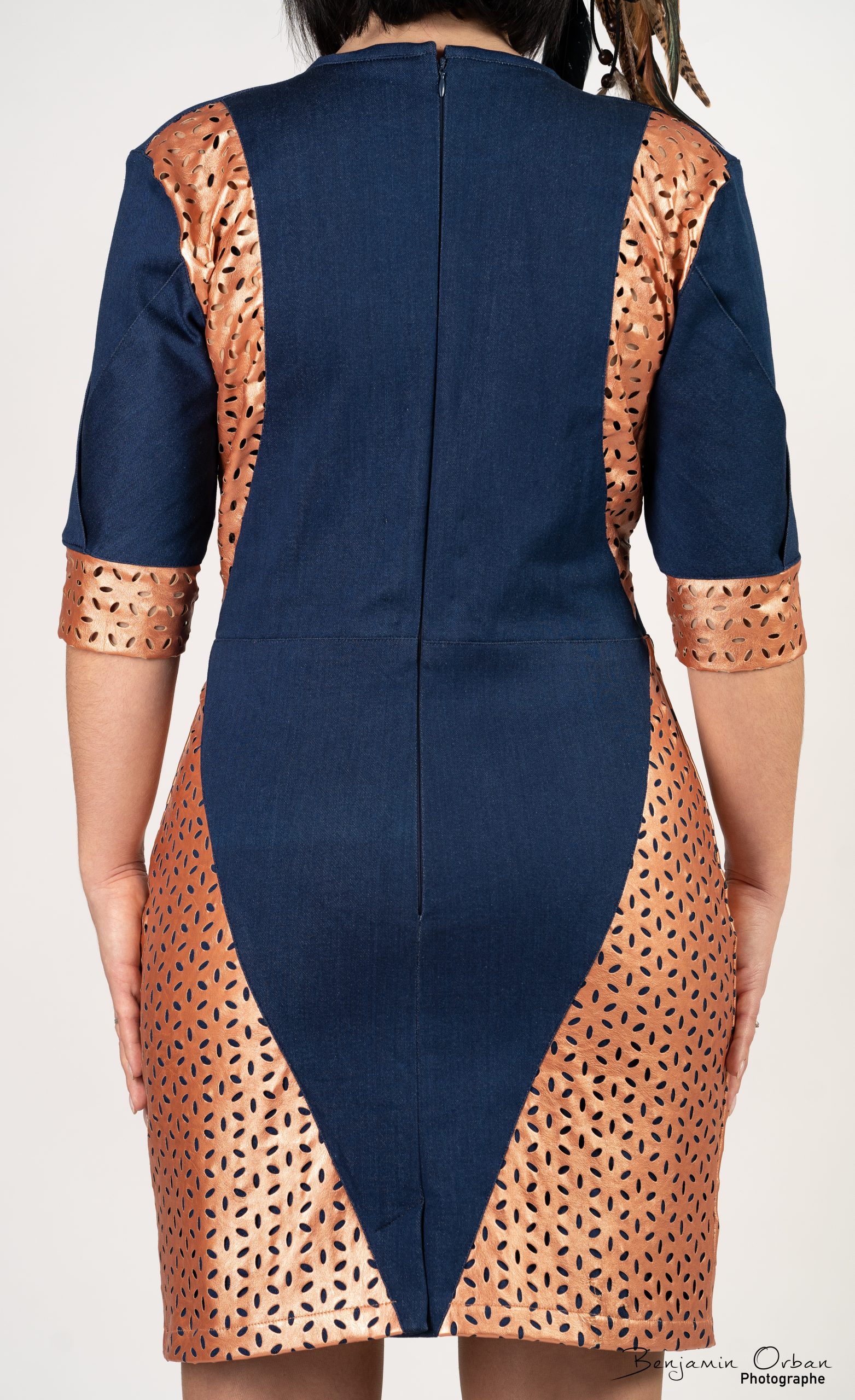Une robe avec une coupe géométrique, pour représenter la complexité du personnage. Jeans bleu foncé et polyester couleur bronze, confortable grâce à l’élasticité des tissus.